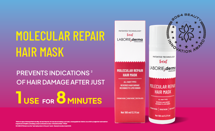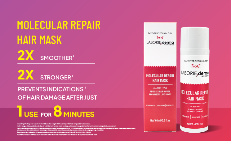 LABORIE derma’s award-winning Molecular Repair Hair Mask offers revolutionary, deep hair repair through its innovative Lipid Bond Technology.